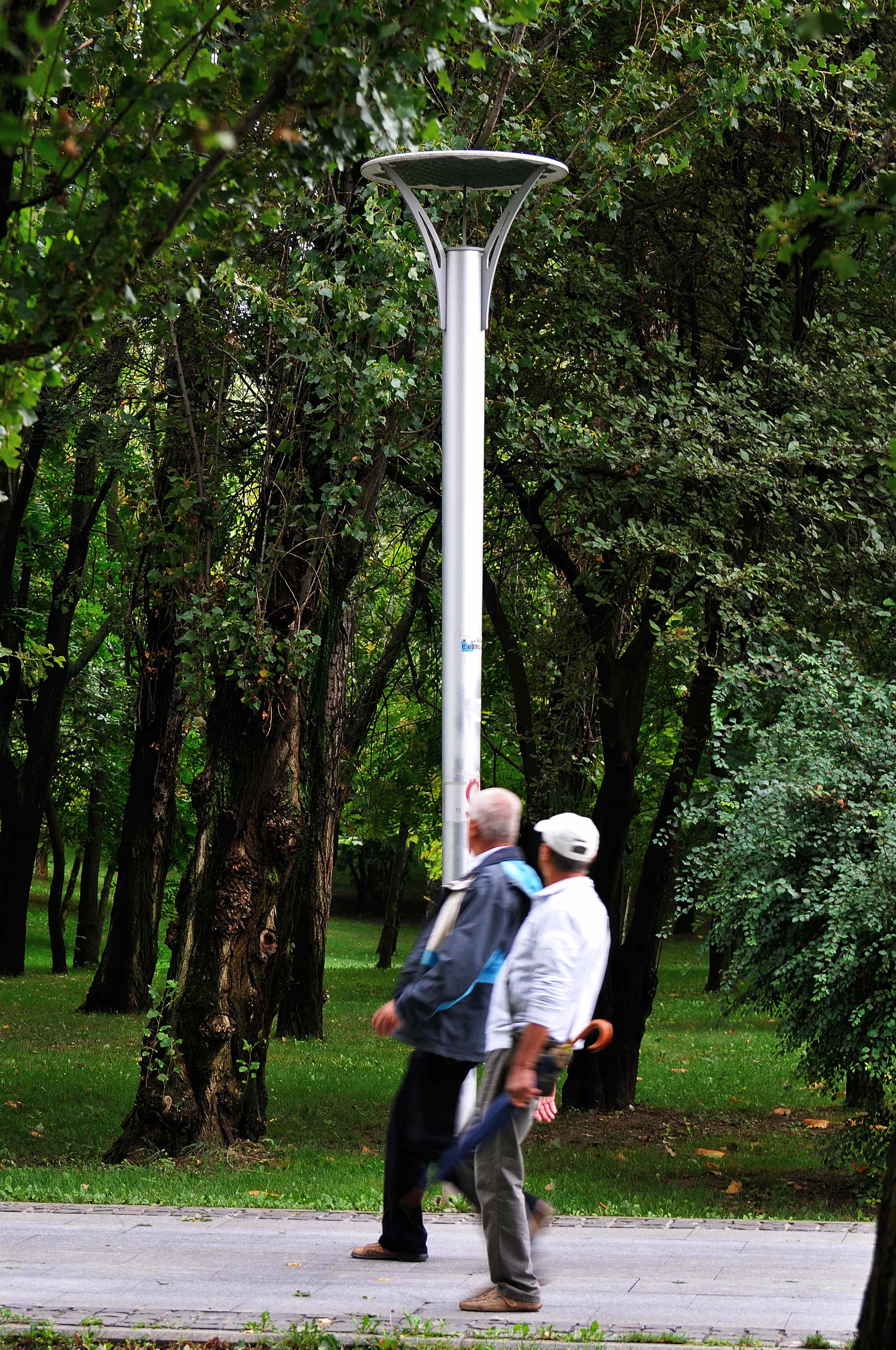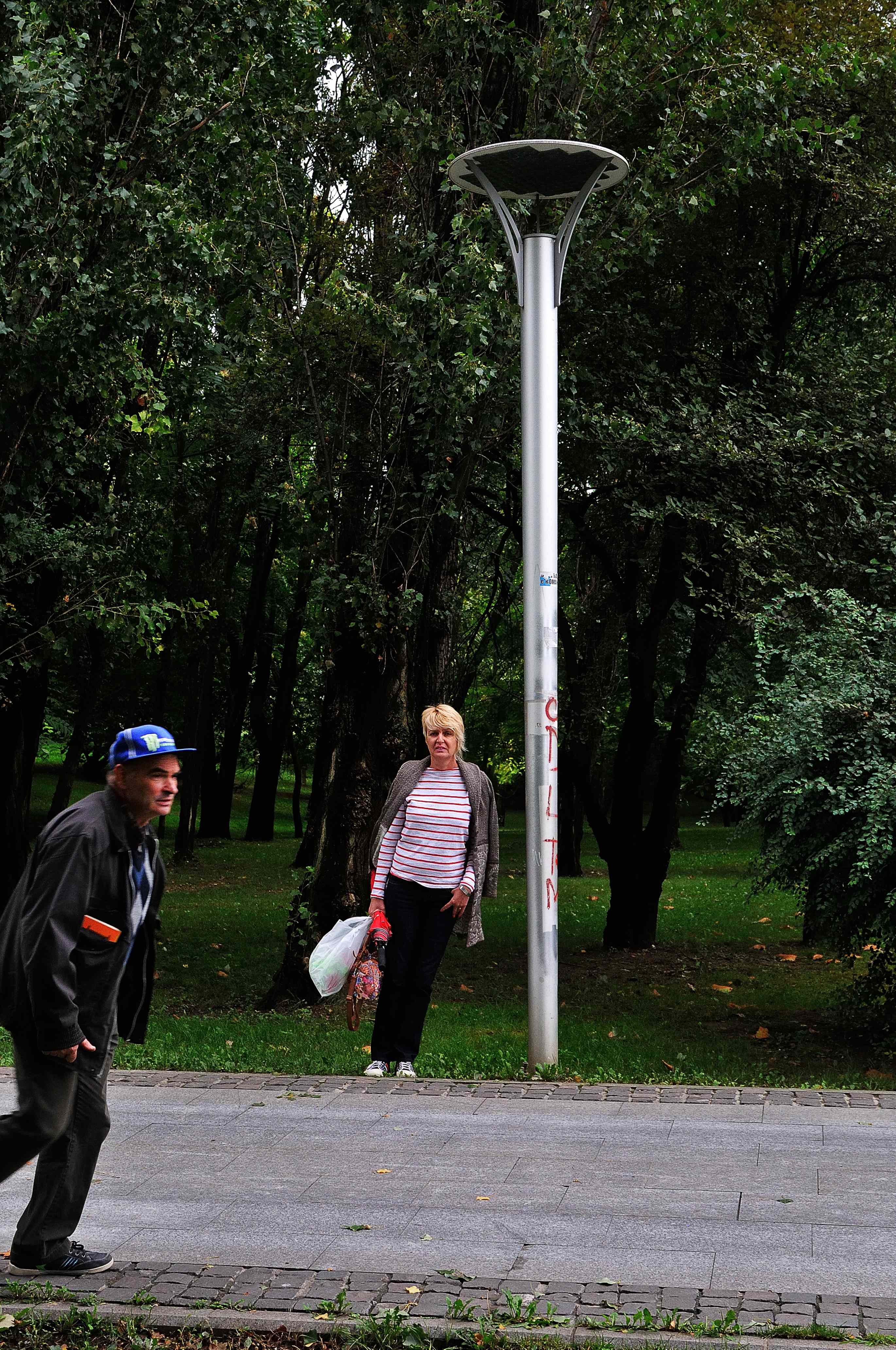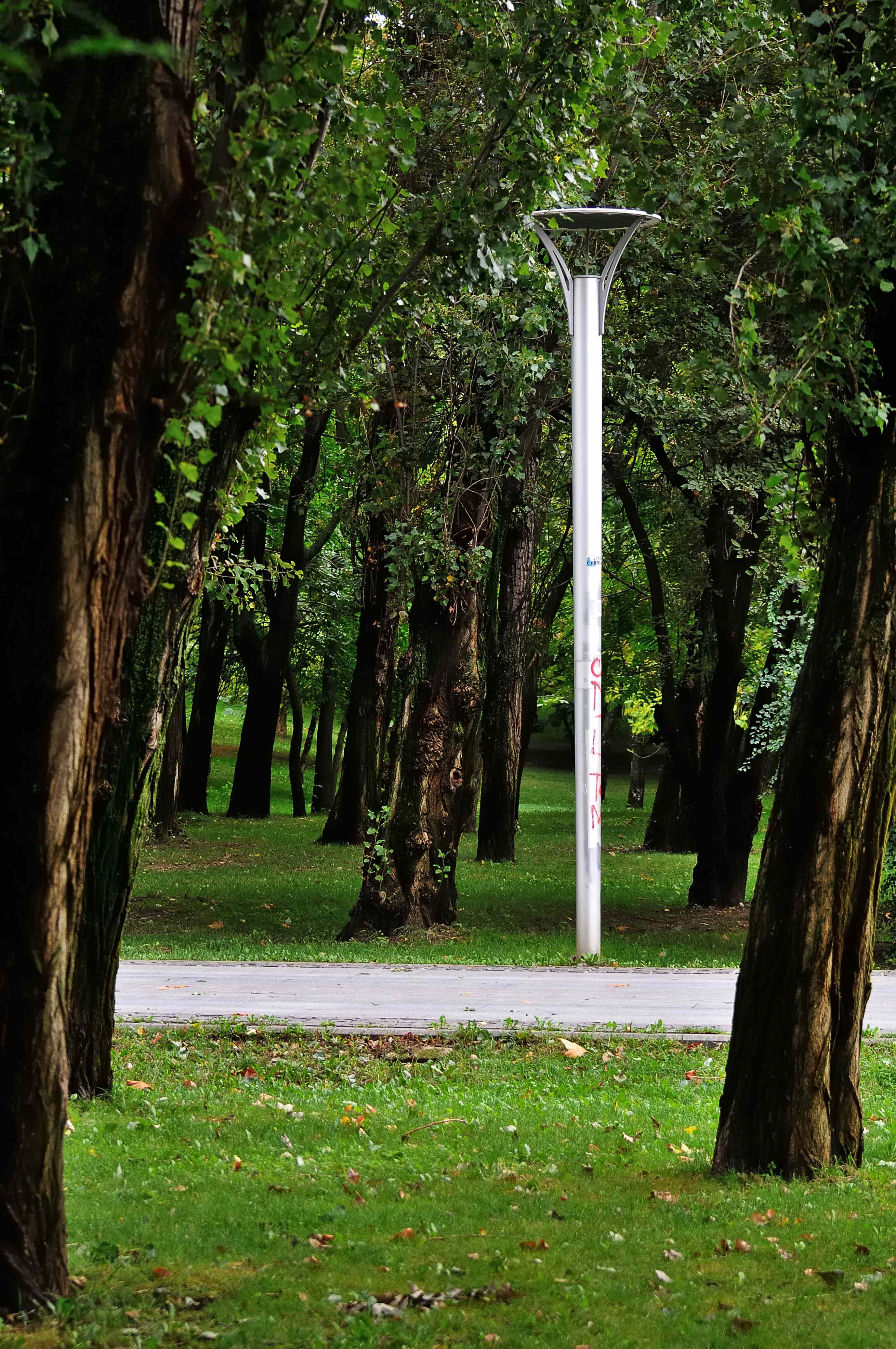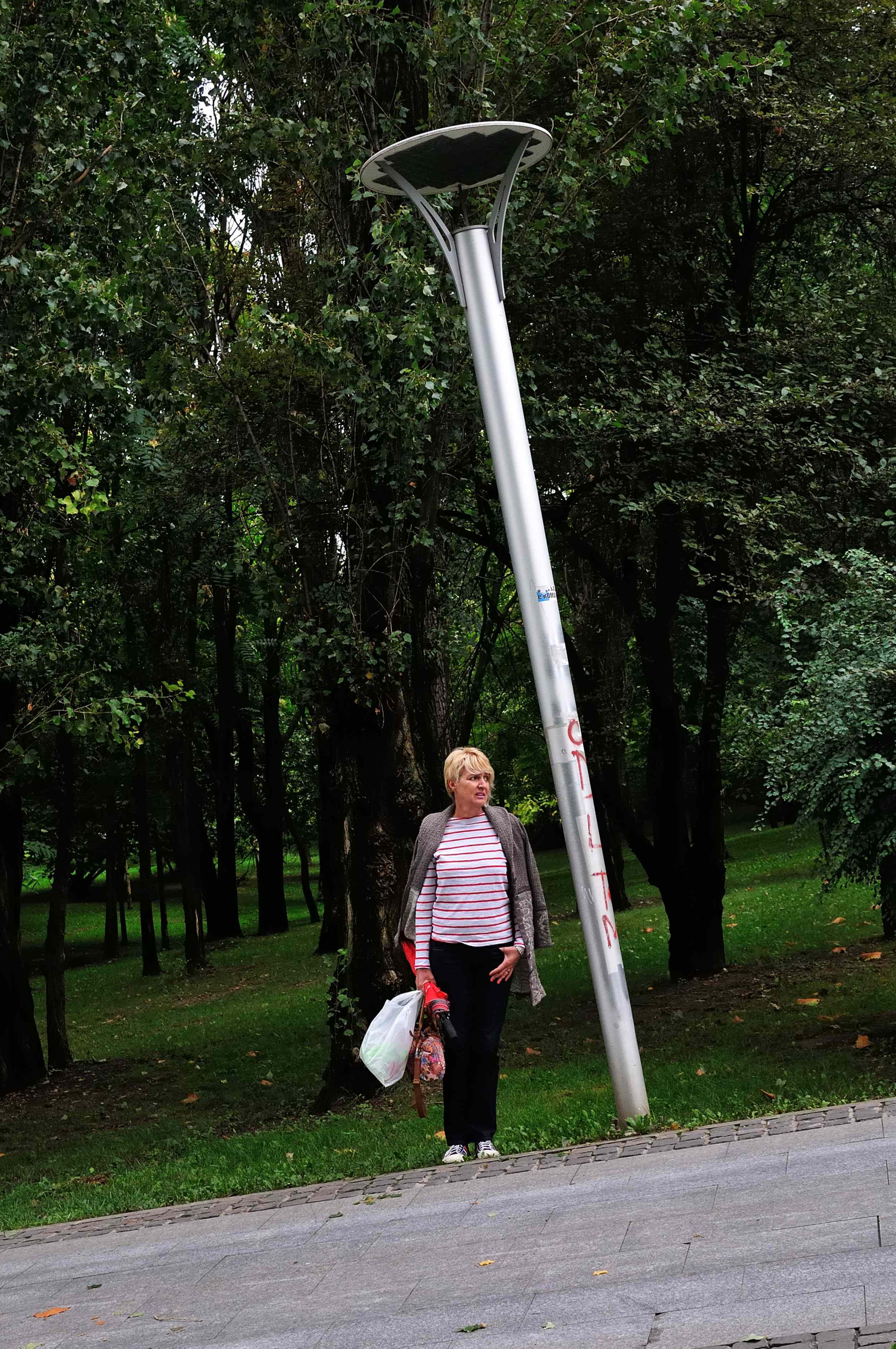 No lamp post was hurt during this shooting. I couldn’t figure out if the one featured here was planted like this on purpose or by mistake. Fact is that instead of being vertical it is perpendicular on the alley. Which goes down a steep hill!