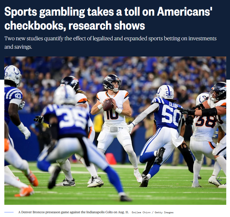 Using datasets showing deposits and withdrawals into and out of online sports betting platforms like FanDuel and DraftKings, as well as to and from equity brokerage accounts like Charles Schwab, E-Trade, Vanguard and Fidelity, Baker and his co-authors found that legalization has led to higher credit card balances, lower access to credit, a reduction in longer-term and higher-yield investments, as well as an increase in lottery play — with the effects particularly pronounced among financially constrained households.