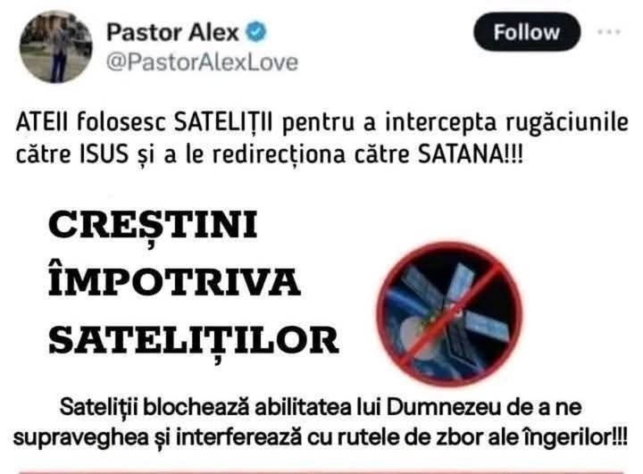 „Sateliții blochează abilitatea lui Dumnezeu de a ne supraveghea și interferează cu rutele de zbor ale îngerilor!!!” e o aberație mai mare decât creația. Decât creația lui Dumnezeu!