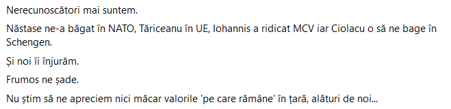 “Pentru că vă este bine, pentru că aveţi IKEA, Ryanair, Blue Air, Carrefour, Mega Image, e-Mag, H&M, Zara, Starbucks, aţi lăsat puterea PSD, pentru că ei ştiu ce să facă cu ea.
