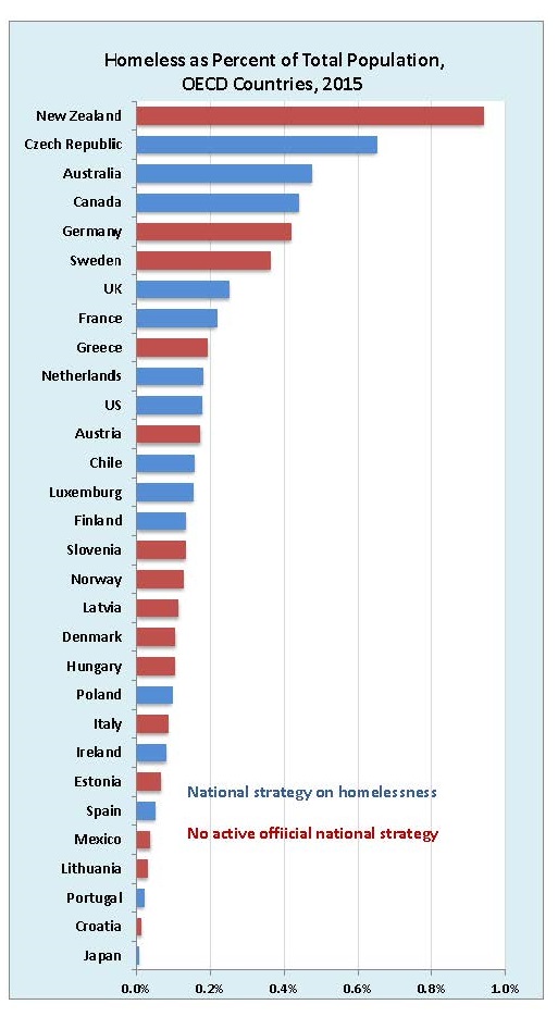For starters, and given the relative size of the US population, there are way more homeless in the US than in the rest of the OECD. Roughly counting, of course.