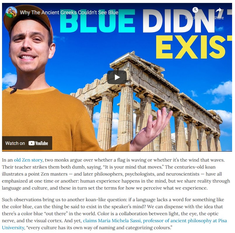 So ‘blue’ had become a fact only after people had invented a word for it… It had existed before hand but we hadn’t noticed it – hadn’t spoken about it, more exactly, until we had a word for it. Until we had learned how to ‘measure’ it…